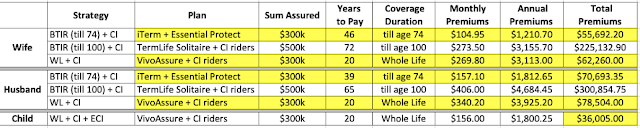DeleteThese findings were surprising to me because I've previously looked only at BTIR vs WL, and always thought the cost differences for the same level of sum assured would be tremendous, but it seems like the gap isn't as big as I had thought it to be. Now it really boils down to one's preferences and what they prioritise - discipline + paying the least but paying all the way even in this age of increasing job redundancy (term) or a paying more upfront for a limited time during one's prime working years and being covered for life without worrying about anything else later (whole life). It really is a case of choosing between the opportunity cost of time and money now and in the future!